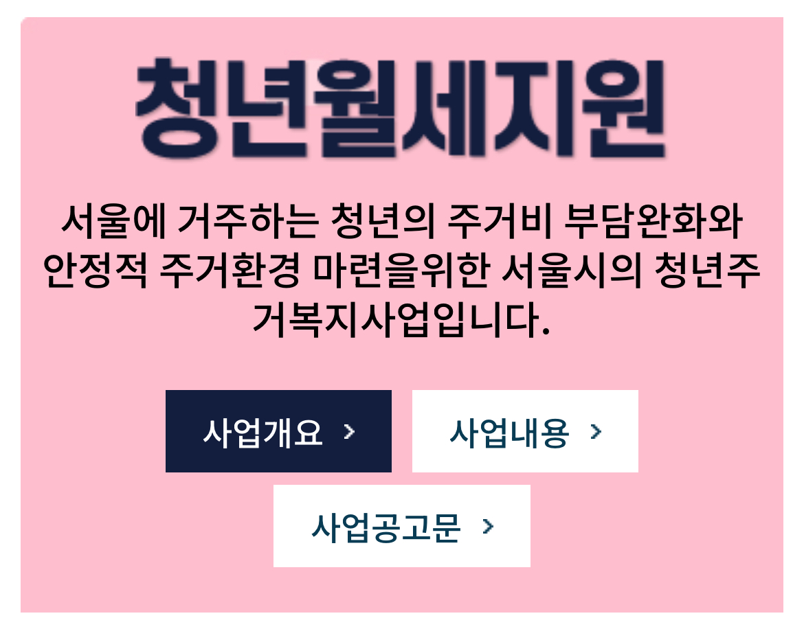 서울에 거주하는 청년의 주거비 부담완화와 안정적 주거환경 마련을 위한 서울시의 청년주거복지사업입니다.