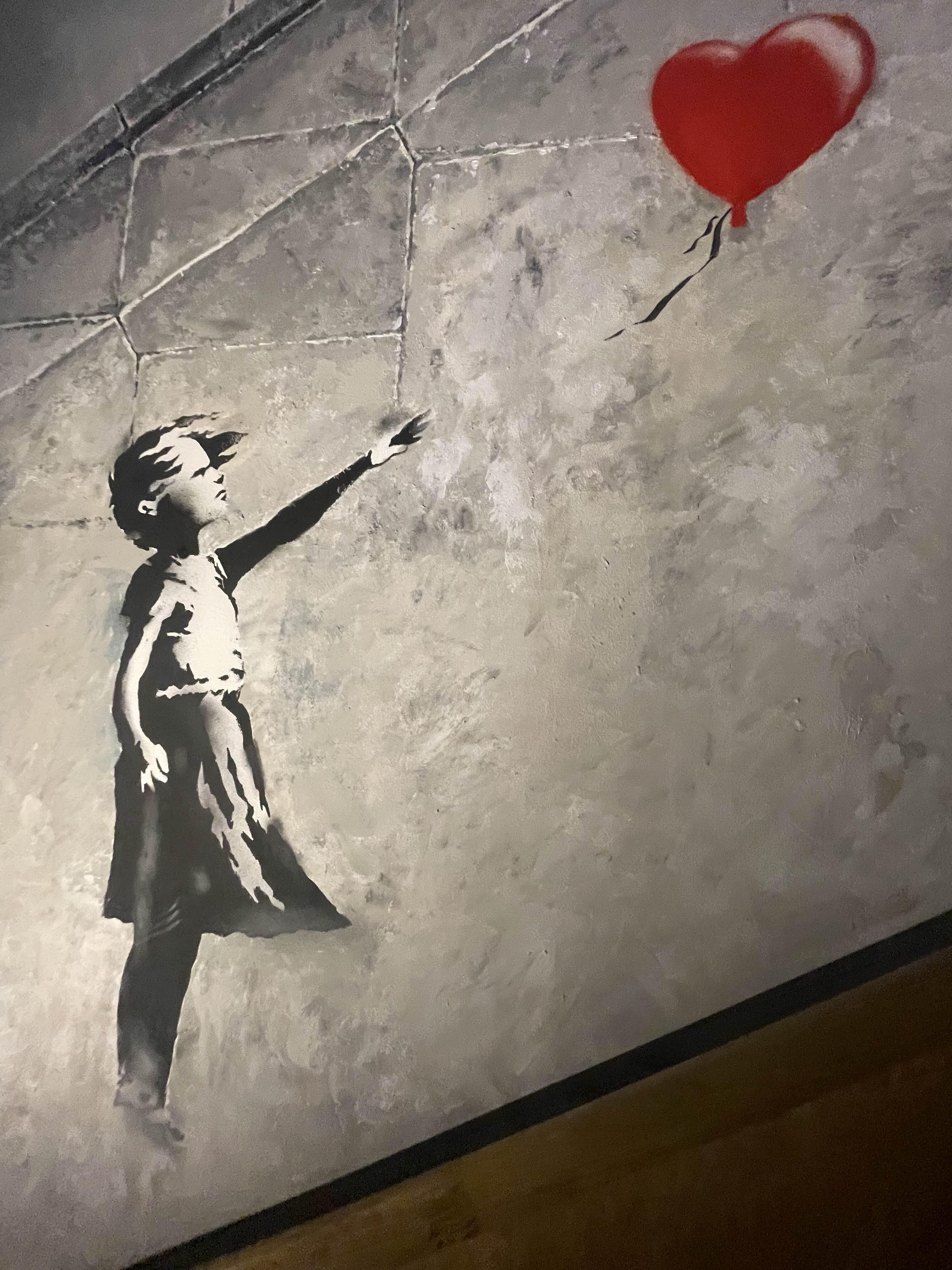 전시의 하이라이트를 몇 가지 꼽자면, 역시나 “소녀와 풍선” 작품이 제일 먼저 떠오르네요. 이 작품은 너무 유명해서 다들 아시겠지만, 이번 전시에서는 조금 다른 해석으로 소개됐어요. 원작이 가지고 있는 희망과 순수의 느낌은 그대로지만, 여기에 더해 현대 사회에서 우리가 잃어버린 가치와 꿈을 되찾으라는 메시지가 추가된 듯했어요.