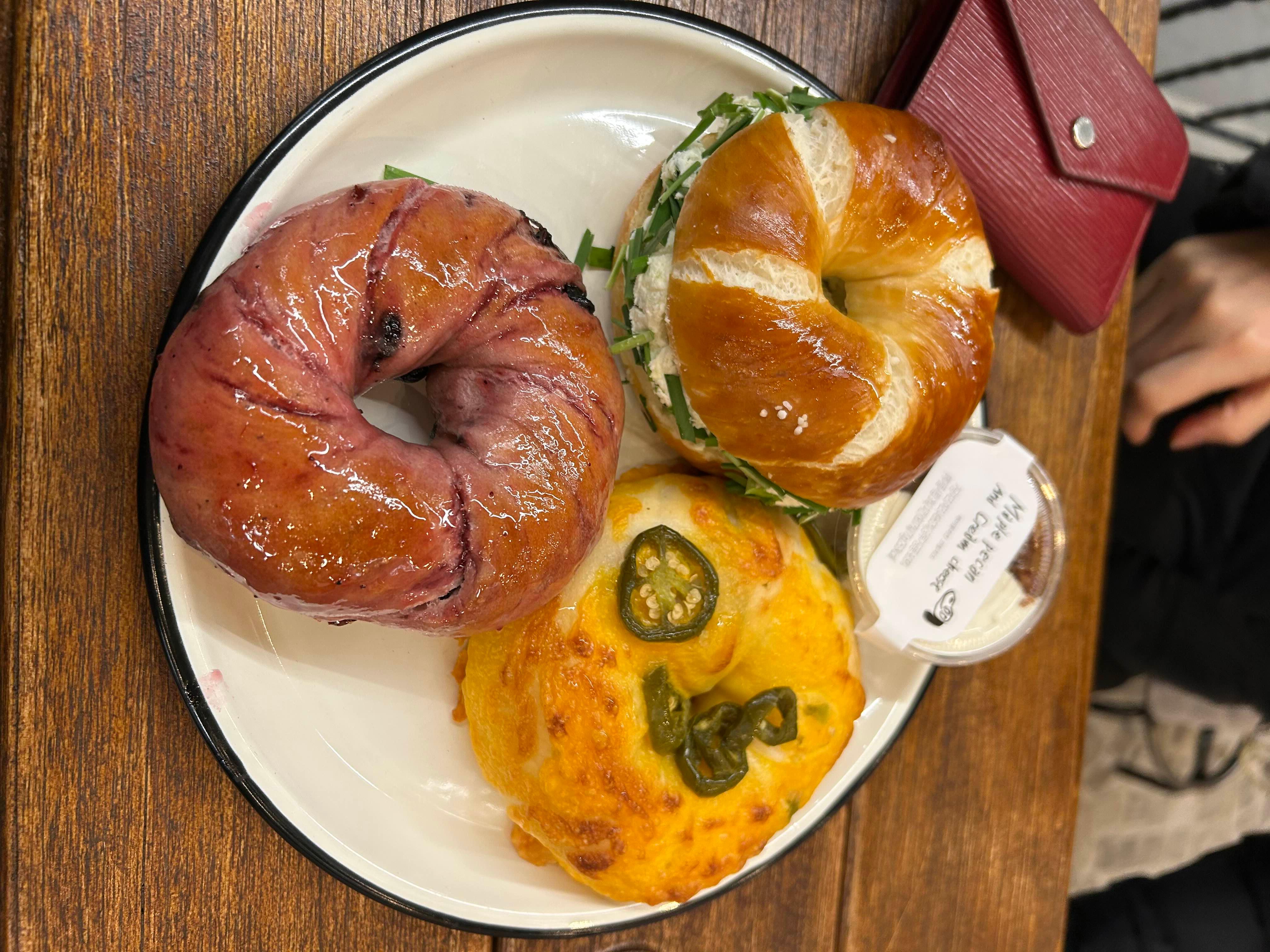 이번에 먹어본 메뉴는 블루베리 베이글, 할라피뇨 베이글, 그리고 스프링어니언 크림치즈 베이글이에요. 하나씩 간단히 후기 남길게요!